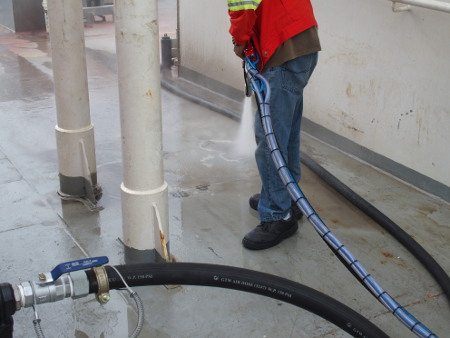 If you connect a conventional 300 lbs shipyard blast set to the ship air onboard, nothing happens since ship air pressure is insufficient.