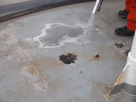 Only grit blasting gives over 5 years repair life. Aquajet AJ-50X and AJ-150XL are small 50 or 150 lbs blasters on wheels, designed to eradicate deck rust with ease. Blasters powered by ship air pressure, little natural grit and very little fresh water.