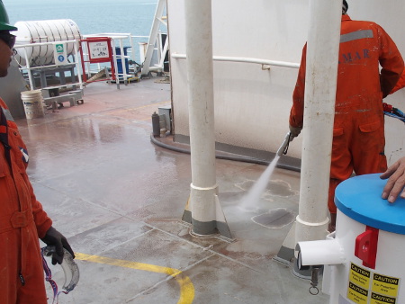 Aquajet, powered by 7-8 bar ship air pressure only, requires NO electricity, consumes very little water and only 1-3 tons of grit a month.